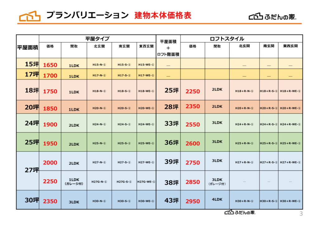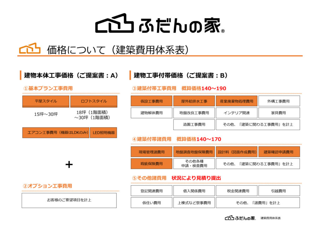 ※ 「ふだんの家」は規格住宅となっており、自由設計のデザイン住宅の価格とは異なっております。